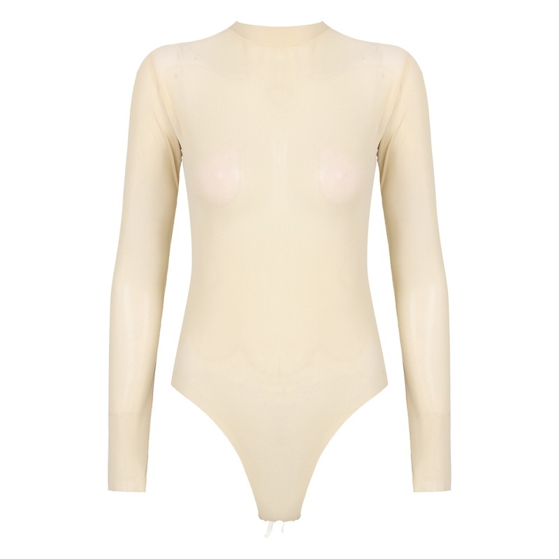 Womens See-through Long Sleeve Bodysuit Crew Neck High Cut Leotard.